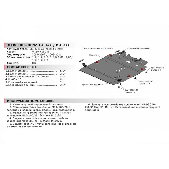 Защита картера и КПП АвтоБРОНЯ для Mercedes-Benz A-class (V - 1.5; 1.7; 2.0; 1.6d; 1.8d; 2.0d) 2004-2007, крепеж в комплекте, сталь, 2 мм, 111.03916.1