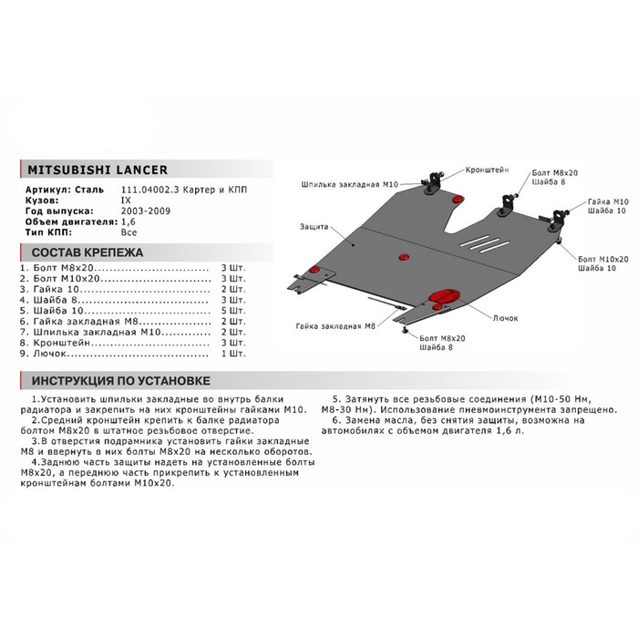 Не секрет, что машина давно уже перестала восприниматься как просто средство передвижения, и водители покупают всё лучшее для своих железных коней. Защита картера и КПП АвтоБРОНЯ для Mitsubishi Lancer 2003-2009, крепеж в комплекте, сталь, 2 мм, 111.04002.3 — идеальный выбор, если вы ставите целью и улучшение технических характеристик, и поддержание внешнего вида автомобиля.