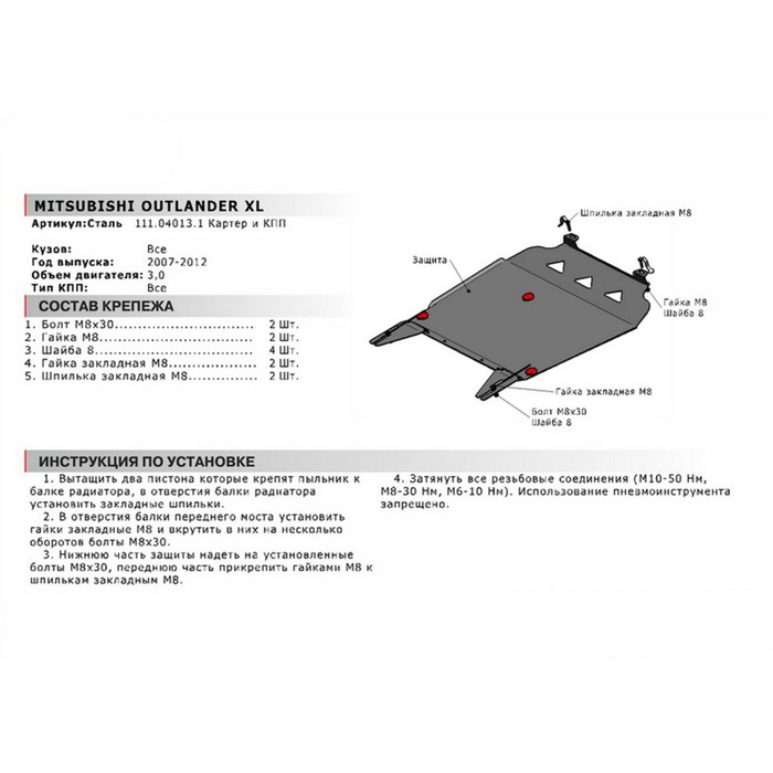 Не секрет, что машина давно уже перестала восприниматься как просто средство передвижения, и водители покупают всё лучшее для своих железных коней. Защита картера и КПП АвтоБРОНЯ для Mitsubishi Outlander XL (V - 3.0) 2007-2012, крепеж в комплекте, сталь, 2 мм, 111.04013.1 — идеальный выбор, если вы ставите целью и улучшение технических характеристик, и поддержание внешнего вида автомобиля.