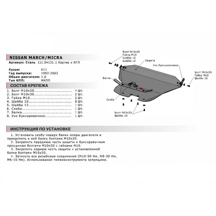 Не секрет, что машина давно уже перестала восприниматься как просто средство передвижения, и водители покупают всё лучшее для своих железных коней. Защита картера и КПП АвтоБРОНЯ для Nissan March (V - 1.0) 1992-2002, крепеж в комплекте, сталь, 2 мм, 111.04131.1 — идеальный выбор, если вы ставите целью и улучшение технических характеристик, и поддержание внешнего вида автомобиля.