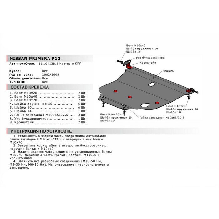 Не секрет, что машина давно уже перестала восприниматься как просто средство передвижения, и водители покупают всё лучшее для своих железных коней. Защита картера и КПП АвтоБРОНЯ для Nissan Primera 2002-2008, крепеж в комплекте, сталь, 2 мм, 111.04128.1 — идеальный выбор, если вы ставите целью и улучшение технических характеристик, и поддержание внешнего вида автомобиля.