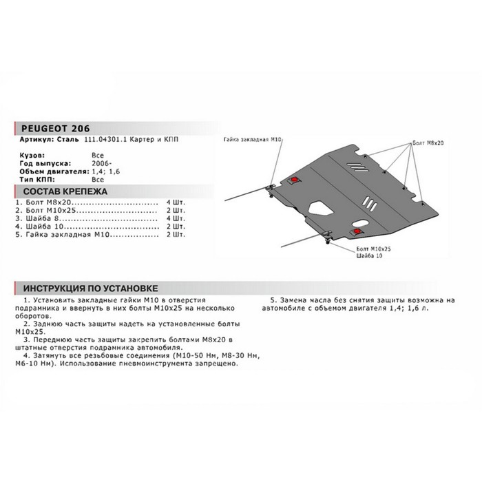Не секрет, что машина давно уже перестала восприниматься как просто средство передвижения, и водители покупают всё лучшее для своих железных коней. Защита картера и КПП АвтоБРОНЯ для Peugeot 206 (V - 1.4; 1.6) 2006-2013, крепеж в комплекте, сталь, 2 мм, 111.04301.1 — идеальный выбор, если вы ставите целью и улучшение технических характеристик, и поддержание внешнего вида автомобиля.