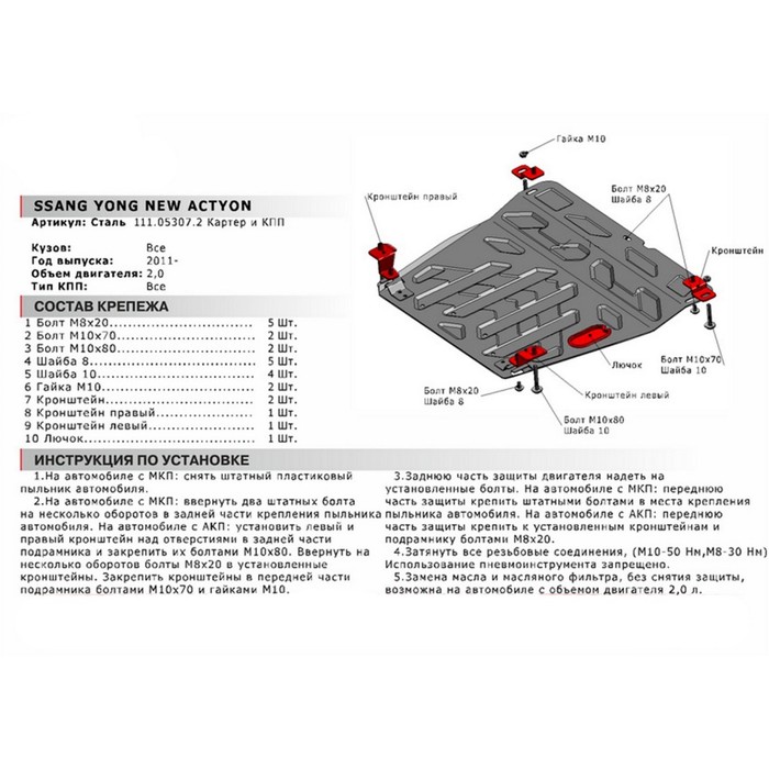 Не секрет, что машина давно уже перестала восприниматься как просто средство передвижения, и водители покупают всё лучшее для своих железных коней. Защита картера и КПП АвтоБРОНЯ для Ssang Yong Actyon 2011-2013 2013-н.в., крепеж в комплекте, сталь, 2 мм, 111.05307.2 — идеальный выбор, если вы ставите целью и улучшение технических характеристик, и поддержание внешнего вида автомобиля.