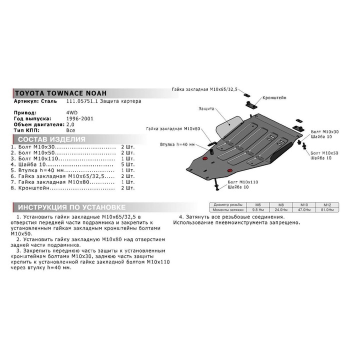 Защита картера и КПП АвтоБРОНЯ для Toyota Townace Noah (V - 2.0 / 4WD) 1996-2001, крепеж в комплекте, сталь, 2 мм, 111.05751.1