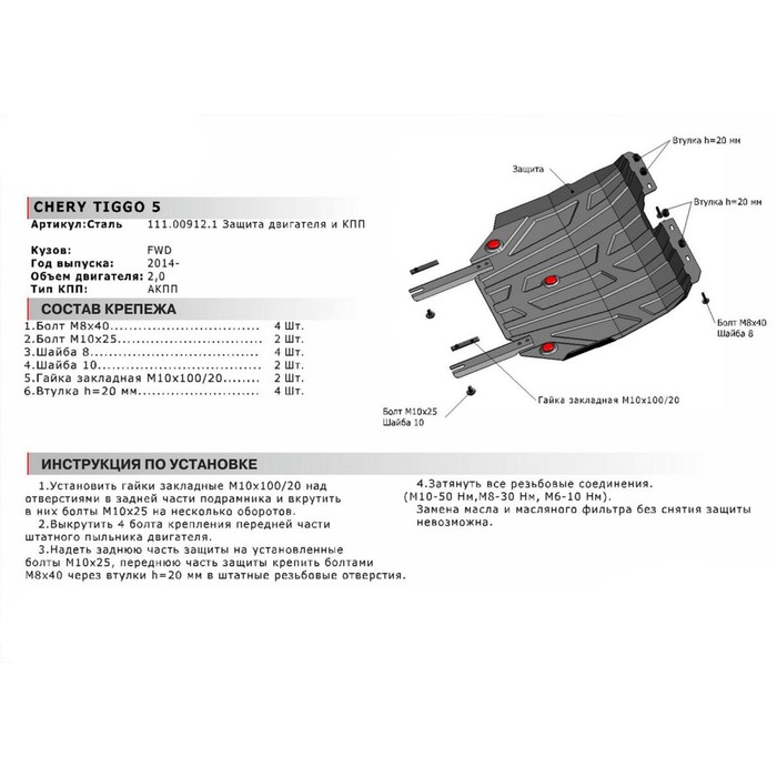Не секрет, что машина давно уже перестала восприниматься как просто средство передвижения, и водители покупают всё лучшее для своих железных коней. Защита картера и КПП АвтоБРОНЯ (увеличенная) для Chery Tiggo 5 (V - 2.0 / FWD) 2014-2016 2016-н.в., крепеж в комплекте, сталь, 2 мм, 111.00912.1 — идеальный выбор, если вы ставите целью и улучшение технических характеристик, и поддержание внешнего вида автомобиля.