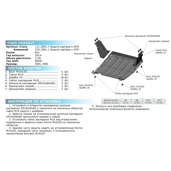 Не секрет, что машина давно уже перестала восприниматься как просто средство передвижения, и водители покупают всё лучшее для своих железных коней. Защита картера и КПП Rival для Ford Transit (V - 2.2d / 4WD) 2014-2017, крепеж в комплекте, алюминий 4 мм — идеальный выбор, если вы ставите целью и улучшение технических характеристик, и поддержание внешнего вида автомобиля.