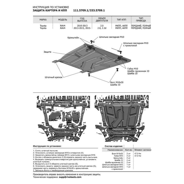 Не секрет, что машина давно уже перестала восприниматься как просто средство передвижения, и водители покупают всё лучшее для своих железных коней. Защита картера и КПП Rival для Toyota Rav4 (V - кроме 2.5) 2010-2013 2013-2015 2015-, крепеж в комплекте, алюминий 4 мм — идеальный выбор, если вы ставите целью и улучшение технических характеристик, и поддержание внешнего вида автомобиля.