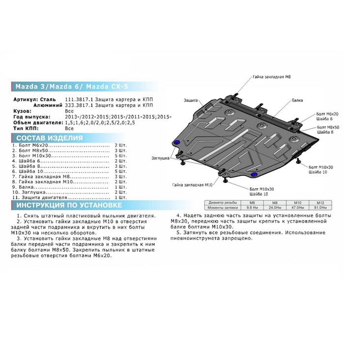 Защита картера и КППRival Mazda CX-5 2011-2015 2015-2017 2017-н.в., 111.3817.1