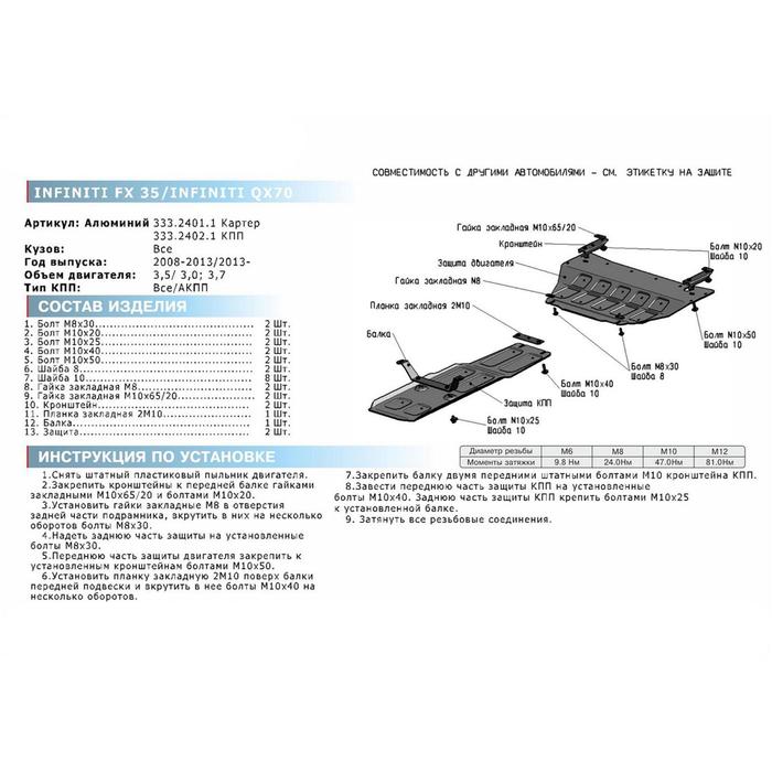 Защита картера Rival для Infiniti FX37 (V - 3.7) 2010-2013, крепеж в комплекте, алюминий 4 мм