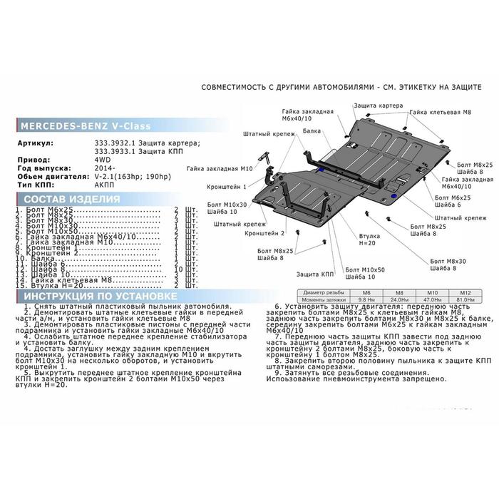 Защита КПП Rival для Mercedes-Benz V-class (V - 2.1d 163/190л.с. / 4WD) 2014-, крепеж в комплекте, алюминий 4 мм
