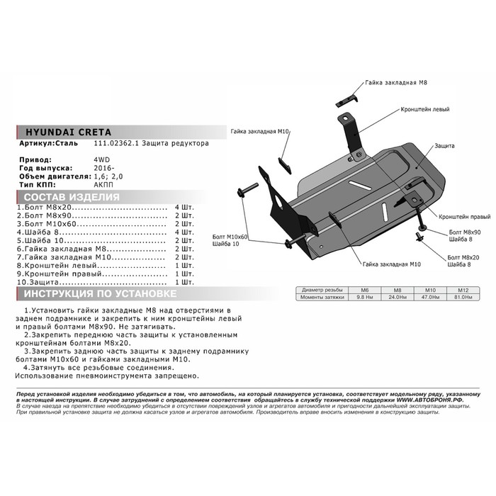 Защита редуктора АвтоБРОНЯ для Hyundai Creta (V - 1.6; 2.0 / 4WD) 2016-н.в., крепеж в комплекте, сталь, 2 мм, 111.02362.1