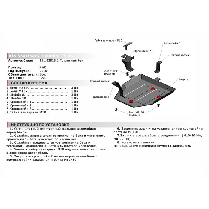 Не секрет, что машина давно уже перестала восприниматься как просто средство передвижения, и водители покупают всё лучшее для своих железных коней. Защита топливного бака АвтоБРОНЯ для Hyundai ix35 (4WD) 2010-2015, крепеж в комплекте, сталь, 2 мм, 111.02828.1 — идеальный выбор, если вы ставите целью и улучшение технических характеристик, и поддержание внешнего вида автомобиля.