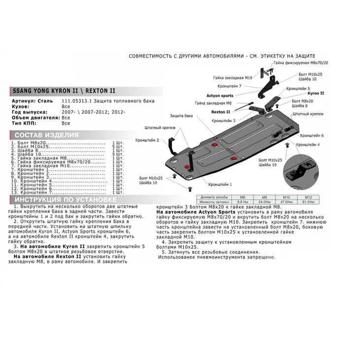 Защита топливного бака АвтоБРОНЯ для Ssang Yong Kyron (V - 2.0d; 2.3) 2007-н.в., крепеж в комплекте, сталь, 2 мм, 111.05313.1