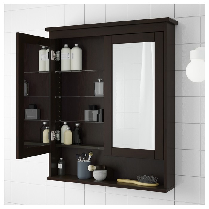 Зеркальный шкаф ХЕМНЭС, 2 дверцы, 83x16x98 см, морилка черно-коричнев прекрасно впишется в интерьер ванной комнаты. Изделие выполнено из влагостойких материалов, которые надолго сохраняют первозданный внешний вид. Теперь хранить гигиенические принадлежности и поддерживать порядок будет легко и просто!