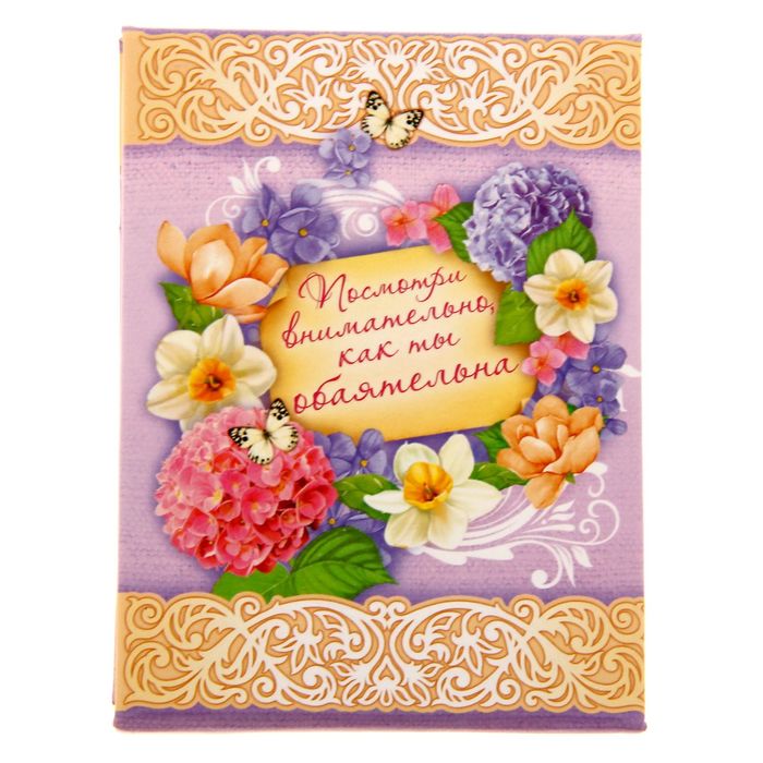 «Свет мой, зеркальце, скажи, да всю правду доложи…» Кто из нас не мечтал о волшебном зеркале? Сделайте мечту явью. Компактное зеркало "Посмотри внимательно, как ты обаятельна" — яркий и удобный аксессуар. Не бойтесь брать его с собой, оно не разобьётся. Ламинированный картон надёжно защищает зеркало от ударов, а удобная подставка пригодится, чтобы поставить его на плоскую поверхность. Подставку украшают тёплые слова и пожелания для адресата. Оригинальное оформление позволит подобрать зеркало под любой стиль одежды и имидж.