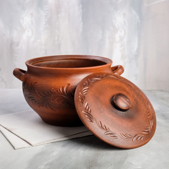 Жаровня — это посуда для приготовления пищи в духовке. Подходит для тушения или длительного томления овощей, мяса, дичи. Она сделана из красной глины и имеет продуманную форму, что обеспечивает теплообмен между жаровней и блюдом, а также помогает сохранить полезные свойства продуктов.