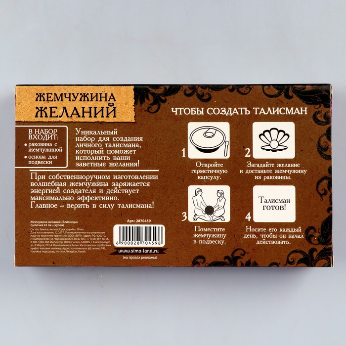 Ни один стиляга не будет выглядеть современно без искусно подобранных украшений, которые завершат его образ! Бижутерия — это современная недорогая альтернатива изделиям из золота и прочих драгоценных металлов. Жемчужина желаний "Зодиак-близнецы" (цепочка 45 см+кулон) — это то, что добавит вам шарма!