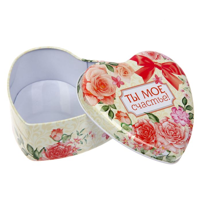 Если у вас есть ювелирные украшения и различная бижутерия, то обязательно должна быть и шкатулка. Тогда в нужный момент вы найдёте подходящий аксессуар или положите его на место, чтобы не потерять. Жестяная шкатулка в форме сердца "Ты мое счастье!", 12 х 11 х 4,5 см предназначена как раз для хранения украшений.
