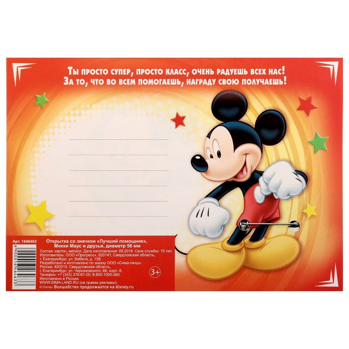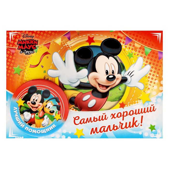 В воспитании и развитии ребёнка важно подчёркивать его достоинства и отмечать все заслуги! Открытка со значком и любимые герои Disney порадуют любого ребёнка. Красочная карточка с приятными словами принесёт положительные эмоции. А яркий значок на булавке украсит одежду!