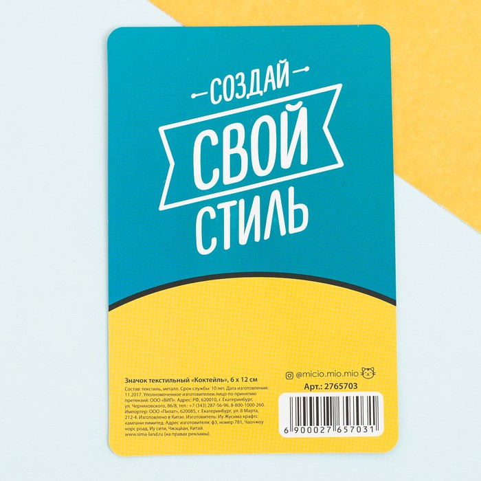 Ни один стиляга не будет выглядеть современно без искусно подобранных украшений, которые завершат его образ! Бижутерия — это современная недорогая альтернатива изделиям из золота и прочих драгоценных металлов. Значок текстильный "Коктейль" — это то, что добавит вам шарма!