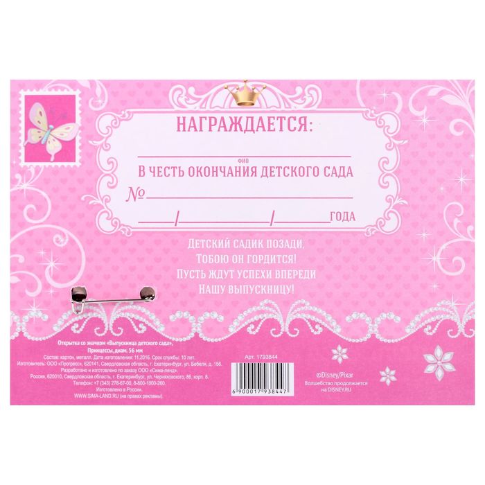 В воспитании и развитии ребёнка важно подчёркивать его достоинства и отмечать все заслуги! Открытка со значком и любимые герои Disney порадуют любого ребёнка. Красочная карточка принесёт положительные эмоции. А яркий значок на булавке украсит одежду!