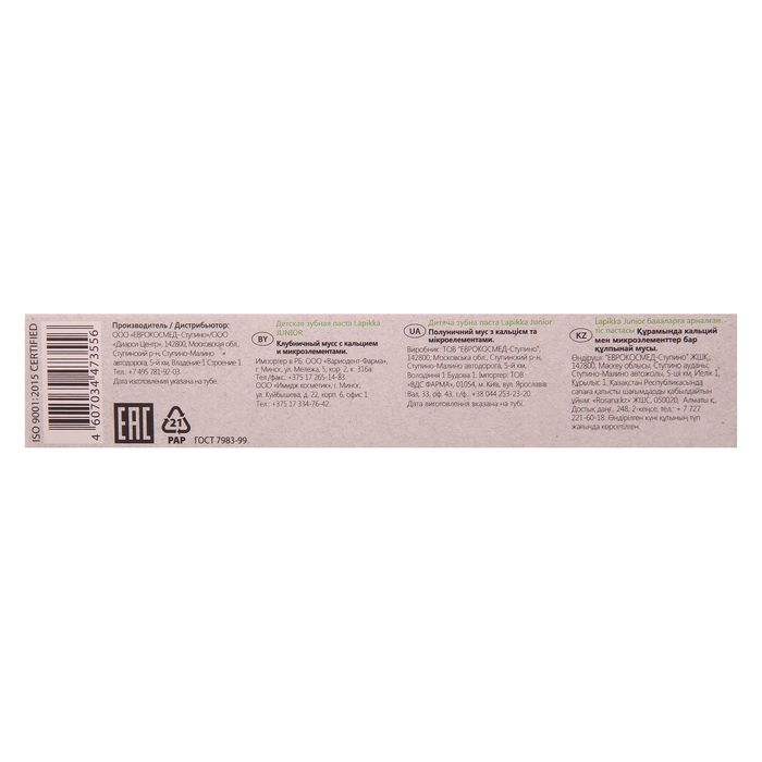 Зубная паста Lapikka Junior "Клубничный мусс" с кальцием и микроэлементами, 74 г