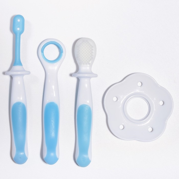 Зубная щётка детская, набор 3 шт. с ограничителем: силиконовая, с мягкой щетиной, для языка, от 3 мес., цвет голубой